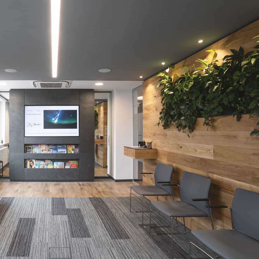 In dem Beispiel zu sehen sind lebendige Pflanzenbilder in der Praxis für MKG-Chirurgie und Zahnmedizin Dres. Brückner – eines unserer Projekte aus dem Jahr 2018. Pflanzenbilder sind eine platzsparende Möglichkeit, um viel Grün und natürliche Farben in Ihre Gewerberäume zu bekommen. Die Wandbefestigung ist mit einem Wasserbehälter ausgestattet, der die Grünpflanzen über eine kapillare Funktion mit Wasser versorgt. Sie müssen lediglich das Wasser mit etwas Dünger nachfüllen. Dann werden die Pflanzen automatisch optimal versorgt.